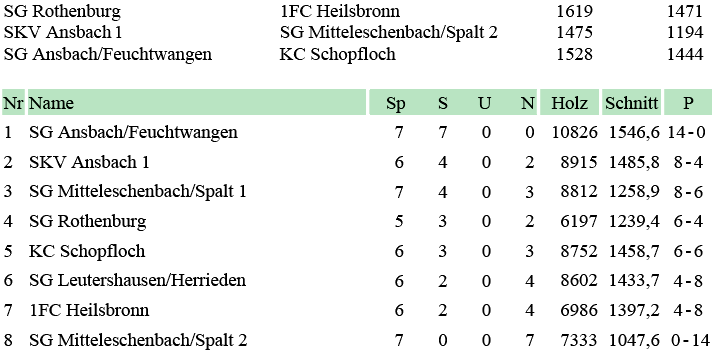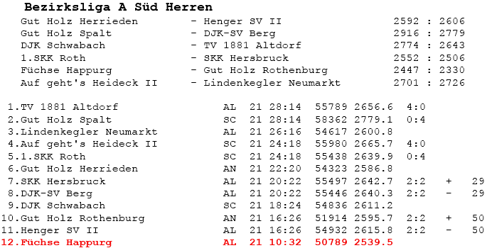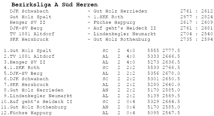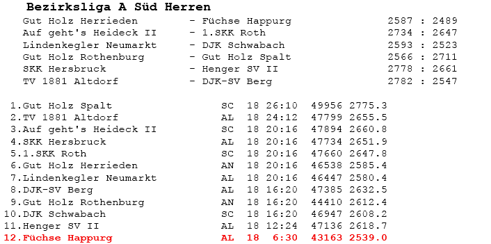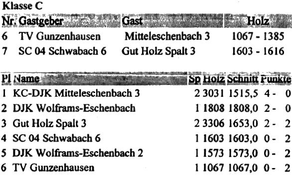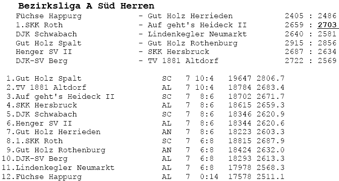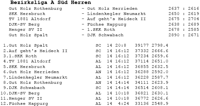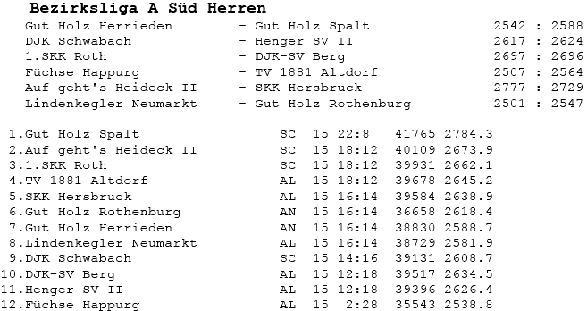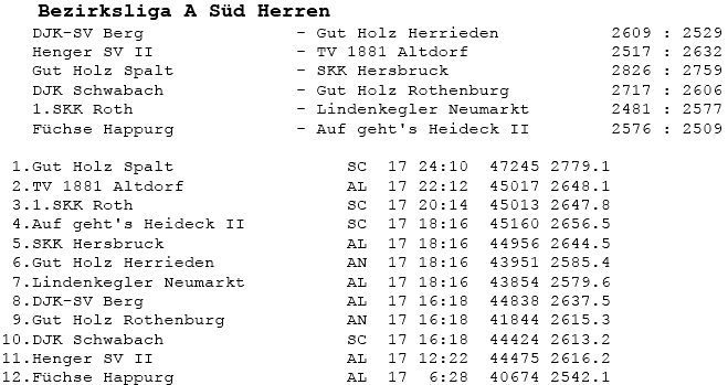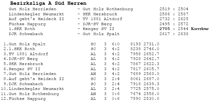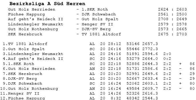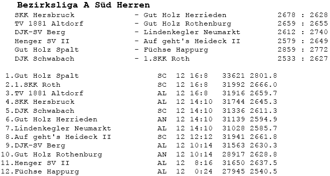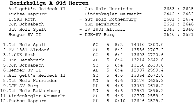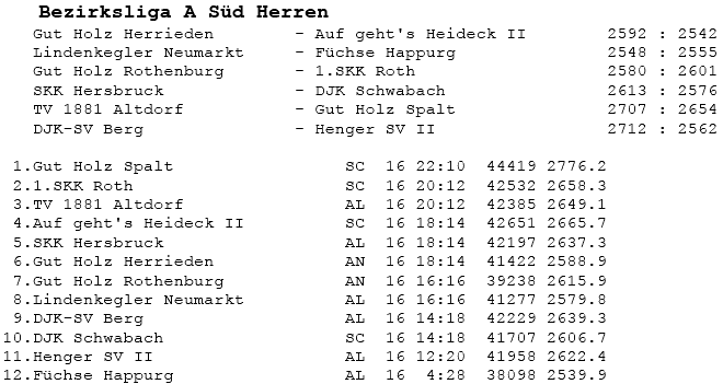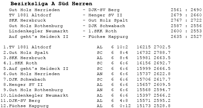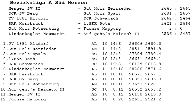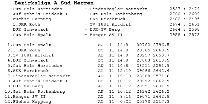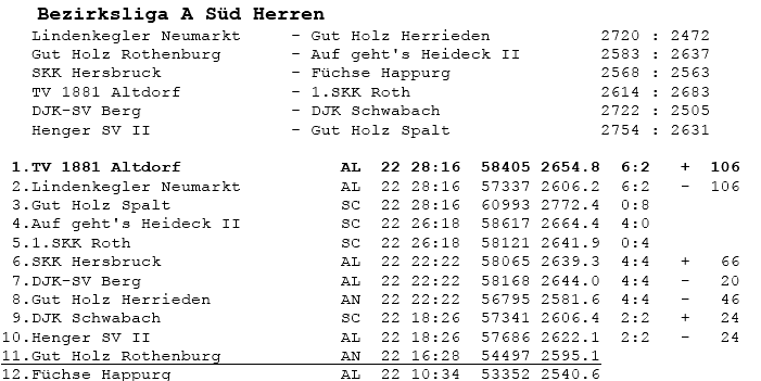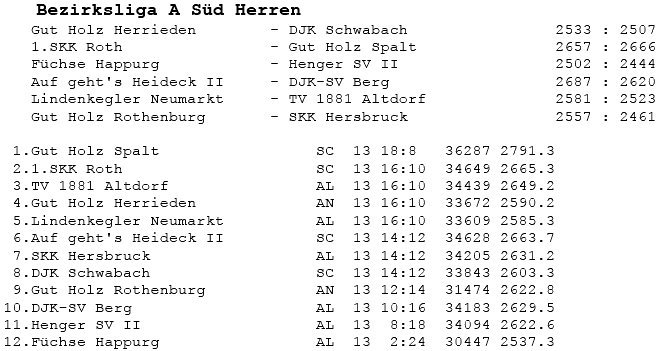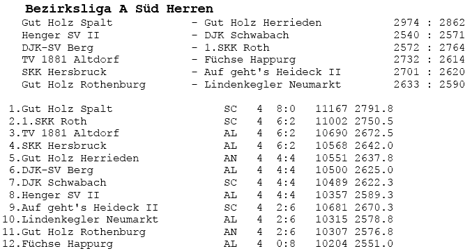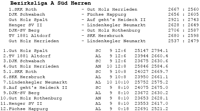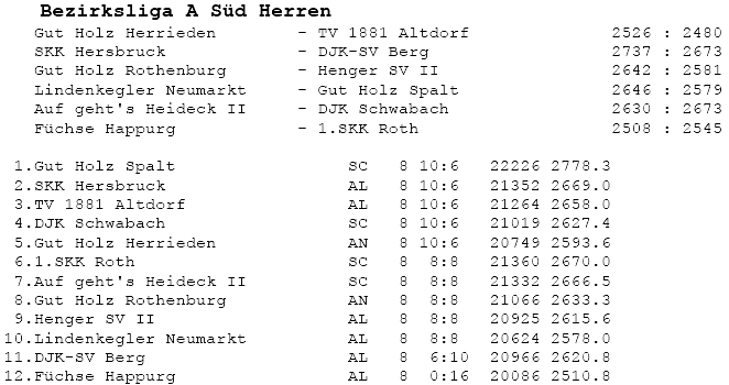| 8 | Sa | 17.11.2007 | 16:30 | Lindenkegler Neumarkt I | A | Tabelle / Schnitt |