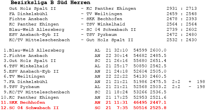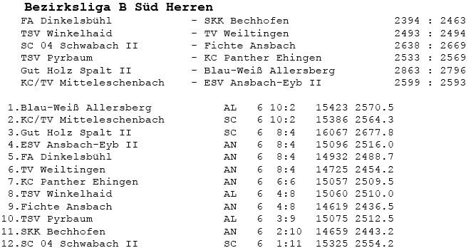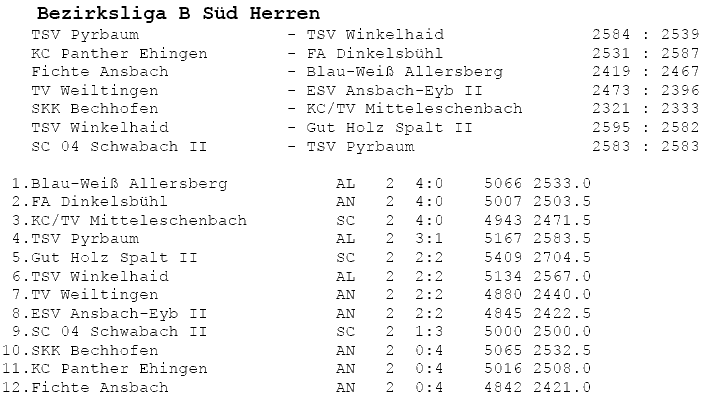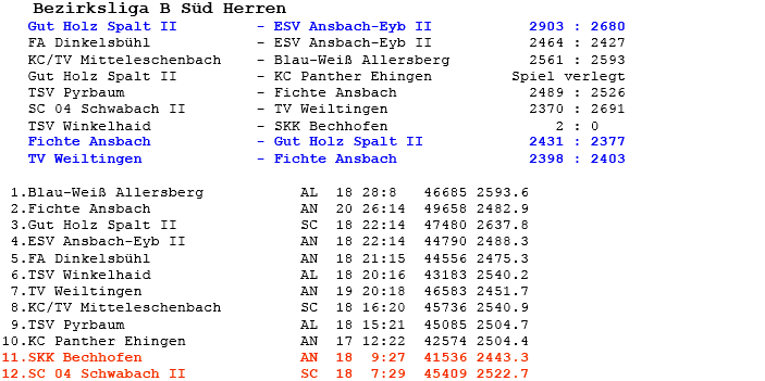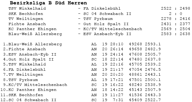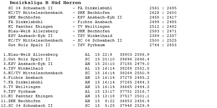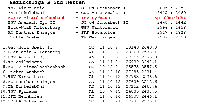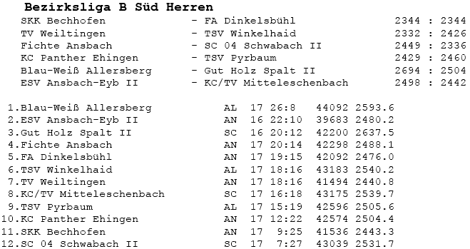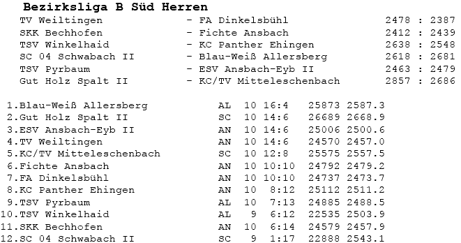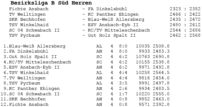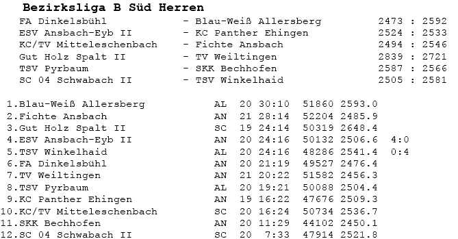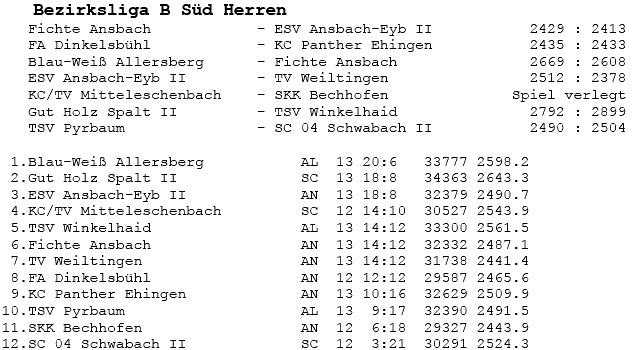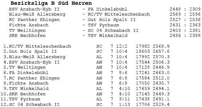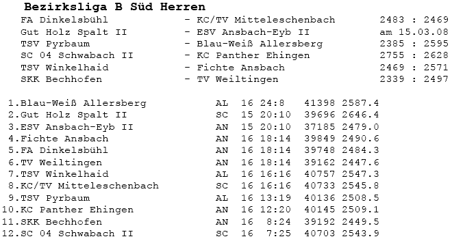 | 16 | Sa | 23.02.2008 | 16:30 | ESV Ansbach-Eyb II | H | Tabelle / Schnitt |