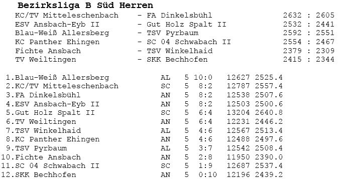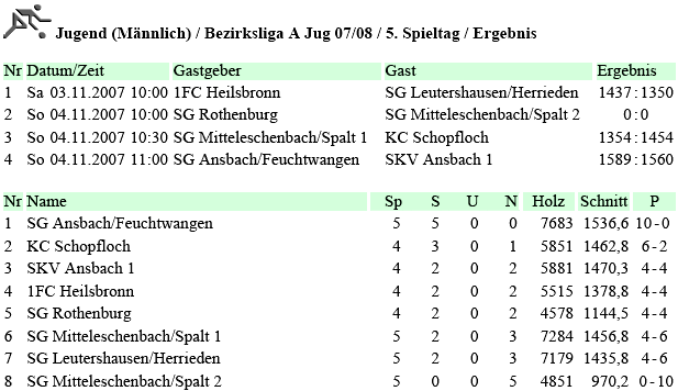 | 5 | Sa | 20.10.2007 | 11:30 | ESV Ansbach-Eyb II | A | Tabelle / Schnitt |