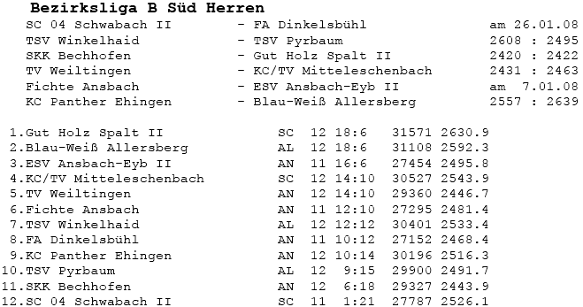 | 12 | Sa | 05.01.2008 | 14:00 | SKK Bechhofen I | A | Tabelle / Schnitt |