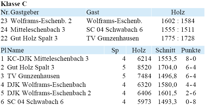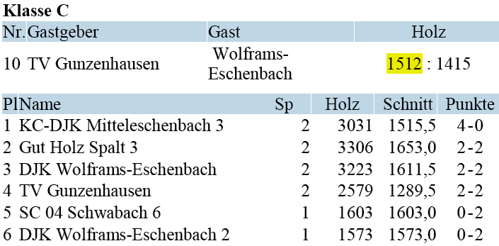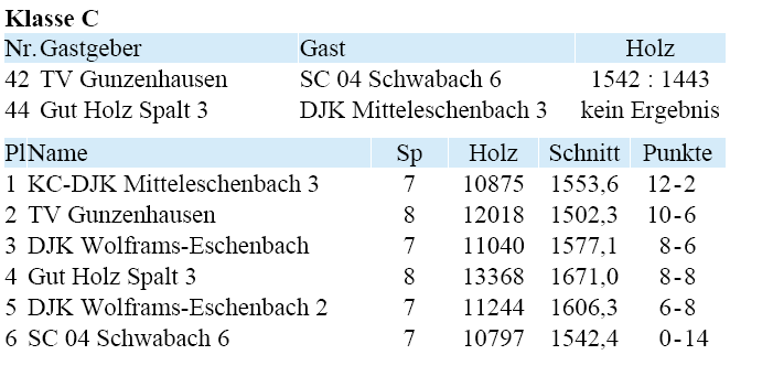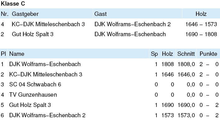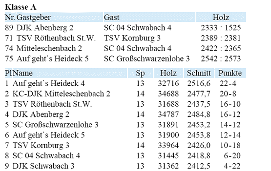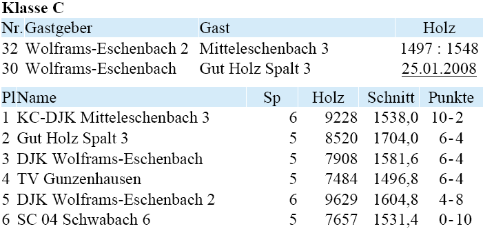 | 21 | Fr | 11.04.2008 | 18:30 | KC/DJK Mitteleschenbach I | A | Tabelle / Schnitt |
